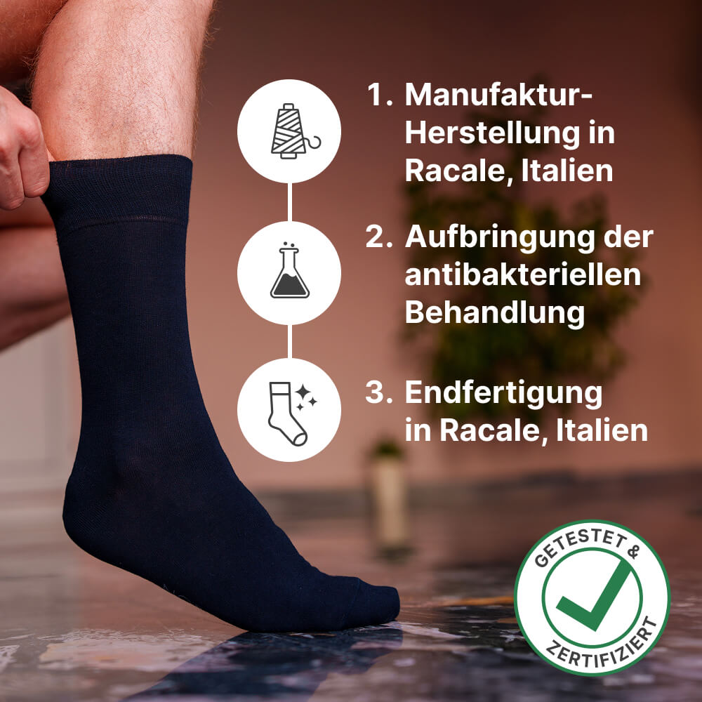 Nach der Produktion erhalten sie eine antibakterielle Behandlung, die im Labor geprüft und zertifiziert ist. Die Verpackung erfolgt intern mit gleicher Sorgfalt: Kein Zwischenhändler, nur direkte Kontrolle und Garant für höchste Qualität.