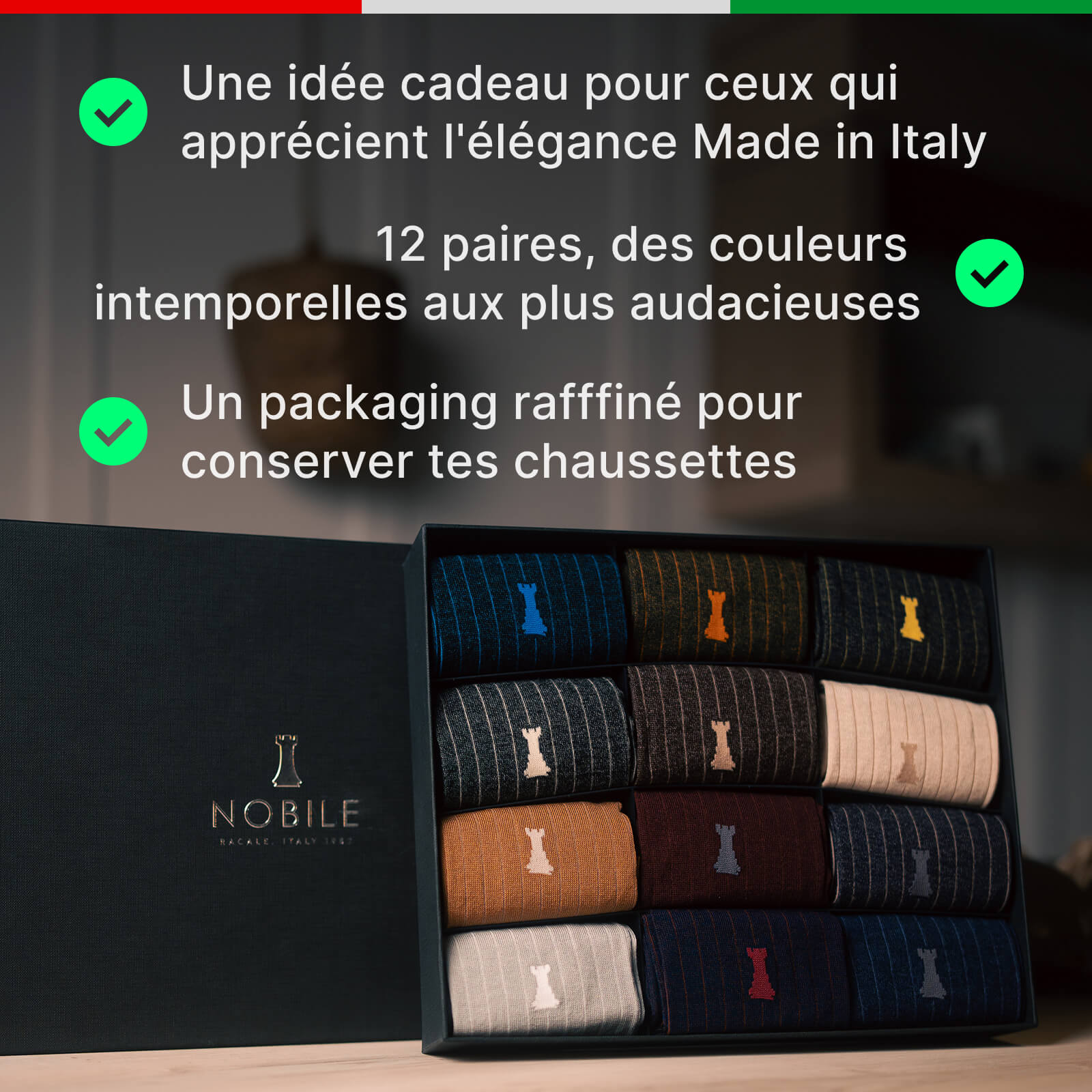 Un Coffret exclusif qui contient 12 paires de Chaussettes signées Nobile 1982, réalisées avec les fils les plus précieux au monde.